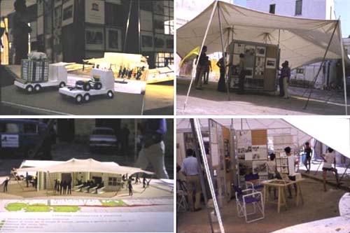 Il laboratorio di quartiere era essenzialmente un grande cubo, che era trasportato su camion (foto in alto a sinistra) e aperto sotto una tenda in modo da dar vita ai quattro settori.