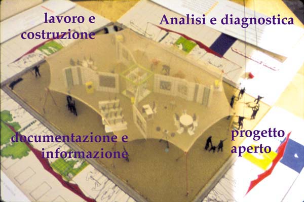 Il plastico del laboratorio di quartiere sul quale sono evidenziati i quattro settori: analisi e diagnostica, progetto aperto, documentazione e informazione, lavoro e costruzione.