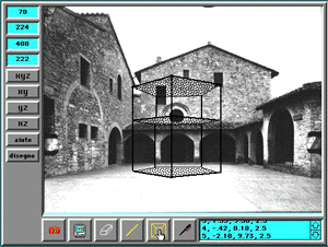Dopo aver indicato in planimetria una serie di punti rilevati è possibile tramite gli strumenti di HyperCard disegnare e digitalizzare il grafico per rappresentarlo, in visione prospettica, sull'immagine fotografica.