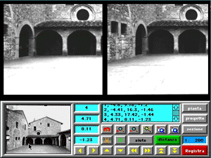 La card "Rilievo" di una scheda fotogrammetrica, che rappresenta il "cuore" del programma. La "bassa" risoluzione dell'immagine digitale, rispetto a quella fotografica, è stata compensata da un notevole ingrandimento dell'immagine numerica, che può scorrere dietro una finestra quadrata (riducibile) di dimensioni 250x250 pixel. Per fare apparire nel quadrato la zona desiderata è sufficiente individuarla con il cursore sull'immagine guida e fare click, oppure utilizzare la fila di pulsanti situata in fondo al pannello comando.