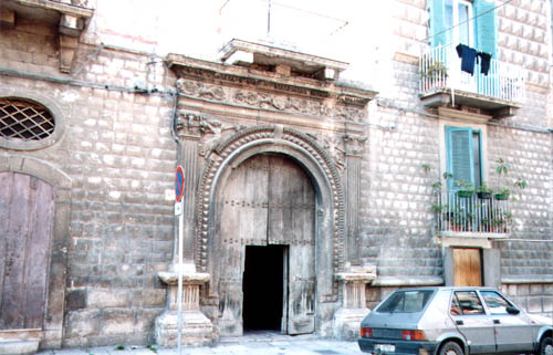 E' ad arco a tutto sesto, profilato da tre diverse modanature, rispettivamente liscia, a punta di diamante e ad ovuli, che si inginocchiano in basso, ripiegandosi verso l'interno. L' insieme e' riquadrato da due lesene, scanalate a partire da un terzo dell' altezza, che poggiano su alti plinti anch' essi scanalati, e terminano con due capitelli di cui uno e' mutilo, l' altro e' decorato nella zona superiore da amorini fra due volatili, e in quella inferiore da foglie di acanto. La trabeazione che conclude il portale e' anch' essa costituita da elementi di gusto classico, con le cornici lavorate ad ovuli e il fregio decorato con girali di foglie, fiori, grifoni, amorini e un medaglione con una testa coronata d' alloro al centro della composizione. Due figure femminili, con vesti sottili dal panneggio mosso, sono inserite nei pennacchi ricavati tra la cornice e l' arco. |