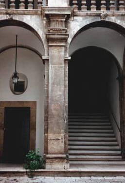 Vista dell' interno del cortile .Prospetto nord con vista della colonna e della scala di accesso alle abitazioni