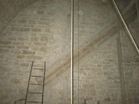 Un secondo problema riguardava il recupero delle pareti. Queste erano quasi completamente rivestite da un intonaco (ovviamente fatiscente) e la scelta dei progettisti fu quella di eliminarlo e riportare a vista la struttura muraria.