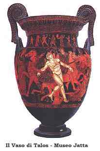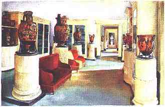 considerevole di divinita' in terracotta tra le quali Venere tra due valve di conchiglia. La seconda stanza raccoglie al centro vasi di notevole grandezza tra i quali le due belle anfore apule una con Antigone prigioniera di Creonte e scena di Amazonomachia, e l'altra con scene di consegna delle armi ad Achille da parte delle Nereidi. Nelle vetrine e' una gran quantita' di vasetti per contenere profumi ed unguenti ed una ricca tipologia di vasi con decorazioni zoomorfe, mitologiche e vegetali in massima parte alludenti a culti funebri. La terza stanza conserva un pregevole cratere proroitaliotacon scena di combattimento tra Ercole e Cicno ed ancora, sulla destra del busto di G.Jatta junior, il bel cratere a colonnette con la lotta tra Bellerofonte sul Pegaso alato contro la Chimera; presenziano Minerva e Nettuno (fine V sec. a.C.). Nelle vetrine e' una ricchissima serie di bicchieri terminanti con teste di animali o umane. La quarta ed ultima sala del Museo contiene al centro il celebre cratere attico con la morte di Talos, del V sec. a.C., considerato uno dei capolavori in assoluto della ceramica greca. Nelle vetrine continua la serie <<rhyta>>, e vasi di importazione corinzia e attica. |