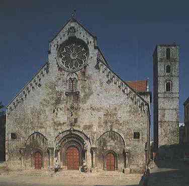| La Cattedrale La Cattedrale di Ruvo, una delle piu' note chiese romaniche di Puglia, fu edificata tra il XII e XIII secolo sui resti di piu' antichi edifici culturali. Recenti scavi sotto il pavimento della chiesa (resi fruibili) hanno infatti evidenziato una successione di presenze che da resti urbani di eta' romana porta ai tempi immediatamente successivi al cristianesimo quando la citta' divenne sede vescovile; seguono i resti di una cattedrale romanica (ne rimangono i pilastri circolari e cruciformi oltre a frammenti di affreschi), crollata intorno all'XI-XII secolo, sui quali si imposto' l'attuale tempio. Quest'ultimo del precedente oltre alle fondamenta, sfrutto' gran parte degli elementi strutturali e decorativi impiegandoli variamente. Sulla facciata, notevolmente slanciata rispetto ad altre cattedrali, furono incastonati i due portali piu' piccoli. Non cosi' e' stato per il bel portali centrale che presenta una fitta e pregevole trama decorativa con elementi vegetali; negli archi superiori, oltre ai quattro simboli degli evangelisti, e' la teoria dei dodici apostoli convergente, con quella degli angeli reggituribolo, alla figura centrale di Cristo. Il tutto e' contenuto nella successione di telamoni, leoni stilofori e grifi. Dopo la bifora col bassorilievo dell'Arcangelo, si apre il grande rosone a dodici raggi anch'esso di grande bellezza; all'apice una nicchia con una figura seduta variamente attribuita. Tutta la facciata principale, come pure quelle laterali, e' movimentata da archetti pensili terminanti con motivi vegetali oppure a teste umane o di animali. Sul lato meridionale, il meglio conservato e sfuggito agli innumerevoli restauri del tempio, gli archetti terminano con sculture di eta' federiciana, tutte ispirate all'antico; tra queste e' una testa coronata forse allusiva allo stesso FedericoII. Staccata dal tempio e' la poderosa torre campanaria (X secolo) forse anticamente torre di difesa inserita nel circuto murario difensivo. L'interno a tre navate, presenta molto evidenti i segni dei frequenti restauri. Nel corso di uno degli ultimi (1899) fu collocato il ciborio ispirato chiaramente a quello della basilica barese di S.Nicola. Altri restauri provvidero a chiudere le numerose cappelle laterali ed a rimuovere il soffitto cassettonato settecentesco, restituendo secondo l'intento dei restauratori, il tempio allo splendore originario. Nel corso della frenetica distruzione delle sovrapposizioni barocche, vennero alla luce i residui frammenti degli affreschi che anticamente ammantavano le pareti del tempio. Sull'altare dell'abside di destra e' una significativa tavola cinquecentesca con la Madonna di Costantinopoli. |