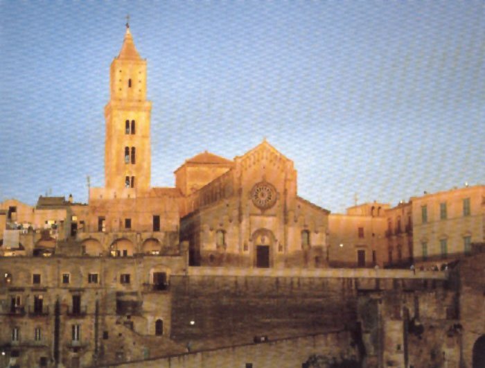 La Basilica Cattedrale si erge sull'altura a cavallo dei due Sassi, comunemente denominata Civita, dov'era anticamente la Chiesa di Sant'Euustachio. Di mirabile stile romanico-pugliese con frontoni incastonati sugli altari, provenienti dai templi caduti di Metaponto. Gli affreschi sono di scuola napoletana. Di grande interesse il Presepe in Pietra lavorata e decorata dallo scultore Altobello Persio di Montescaglioso. |