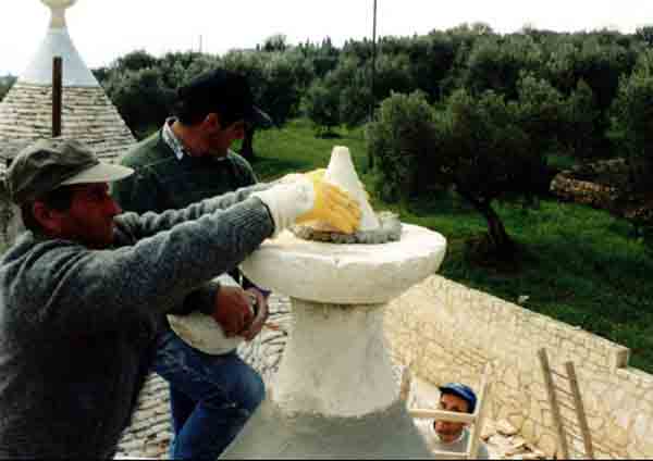 L'elemento successivo di forma conica viene posizionato sul piatto con l'ausilio del legante e su tale elemento verrą disposto successivamente l'elemento finale del pinnacolo di forma sferica.