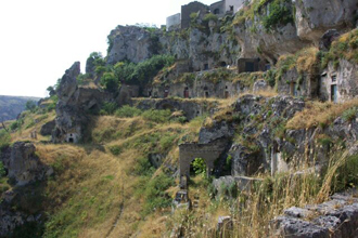 Nell'abitato rupestre del"Villaggio Saraceno", ubicato lungo una valletta confluente nella Gravina, a sud della città, è possibile osservare il complesso "sistema idraulico" realizzato. L'acqua è raccolta lungo le pareti con strutture che attraverso gocciolatoi lungo la parete convogliano le essudazioni della roccia, frutto delle infiltrazioni e della condensazione, in "vasche di decantazione e filtro". Così si alimentano "cisterne" poste all'interno stesso degli ipogei che si aprono sui gradoni sorretti da muri a secco che strutturano il pendio. Lungo i terrazzi scorrono canali paralleli al ciglio della parete , che recuperano gli eccedenti idrici per irrigare i piccoli campi posti davanti alle grotte. La morfologia del terreno e la struttura dei canali fa in modo che le abitazioni non si richiudano su se stesse, come nelle corti a pozzo, ma si svolgano rettilinee lungo la parete. Tuttavia, ogni piccolo gruppo di abitazioni tende ad abbracciare uno "spazio semicircolare", che si incava più profondamente nella roccia, dalle rampe di scale laterali che si prolungano sul terrazzamento. Nasce un'organizzazione formata da più sottoinsiemi che prendono l'aspetto di "ferri di cavallo" uniti tra loro lateralmente, addossati con la parte arcuata alla parete e aperti sulla valle.