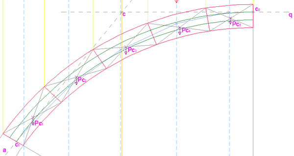 Dopo aver condotto l’analisi dei carichi, esaurientemente riportato in uno degli elaborati progettuali, ed avere effettuato la verifica di stabilità col metodo di Mery, si evince che la curva delle pressioni (rappresentata in figura dalla linea di colore blu) cade in parte al di fuori del nocciolo centrale di inerzia (delimitato dalle linee di colore verde) facendo insorgere nella struttura voltata delle sollecitazioni di trazione che sono incompatibili per questo tipo di strutture. Inoltre nella sezione in chiave come anche nella sezione alle reni il carico di esercizio è superiore al carico ammissibile della muratura. È evidente che la struttura voltata, allo stato attuale, è sottoposta ad un carico di lavoro inammissibile per quelle che sono le caratteristiche del materiale con cui è stata realizzata.