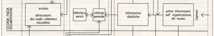 La scheda di ogni pezzo arrivato in museo viene depositata in archivio. Qui vengono raccolte tutte le documentazioni relative come diapositive, audiovisivi, microfilm ecc. L' archivio viene consultato soprattutto dagli studiosi interni al museo ed eccezionalmente da quelli esterni. L' archivio, però, è strettamente connesso con la biblioteca e con gli schedari del catalogo generale, che sono invece aperti a tutti e devono quindi trovarsi in prossimità delle zone fequentate dal pubblico. Negli atri di alcuni vecchi musei si trovano ancora, indicate sulla planimetria dell' edificio per orientare più facilmente il visitatore, le ubicazioni delle sezioni espositive. Oggi queste prime informazioni di carattere generale sono affidate a tabelloni introduttivi, e, avolte, anche ad appositi uffici; sono graficamente curate e di immediata lettura. A queste, progredendo verso l' interno del museo, fanno seguito informazioni più approfondite e specialistiche, fino ad arrivare al catalogo generale. | ||