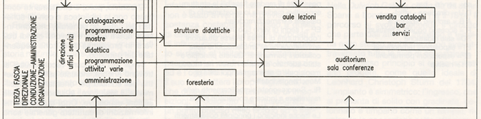 Qui, insieme alla direzione e agli uffici (amministrativi, per la programmazione delle mostre, per la didattica, per le relazioni con la stampa, con altri musei e organizzazioni culturali) sono presenti altre funzioni che ne dipendono direttamente come le attività didattiche, le conferenze e i convegni: anche il controllo e la guida dell'intero organismo museale, nelle sue urgenze vitali, fanno capo a questa fascia. | ||