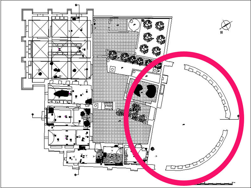All’interno del grande semicerchio, interrotto da un varco con due pilastri terminali che individuano
