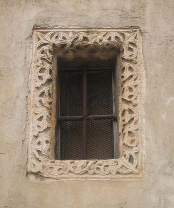 Finestrino con estradosso e intradosso adorno di un bassorilievo a motivi vegetali, appartenente alla vecchia chiesa.